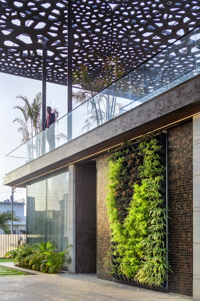 The entrance acts as a grand connector between the two wings. Finished in cooling Gwalior mint stone, it’s animated by softened light and shifting shadows, keeping it comfortable across the day. Oversized doors—about 13 feet tall and 5 feet wide—sit alongside a mild-steel framed partition that also functions as a vertical garden. A Laminam surface with a weathered-iron texture adds a grounded, rustic note to the home’s clean contemporary scale.