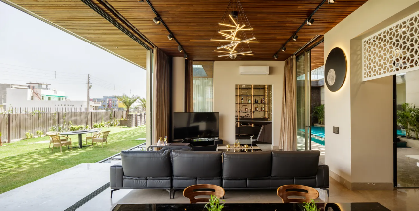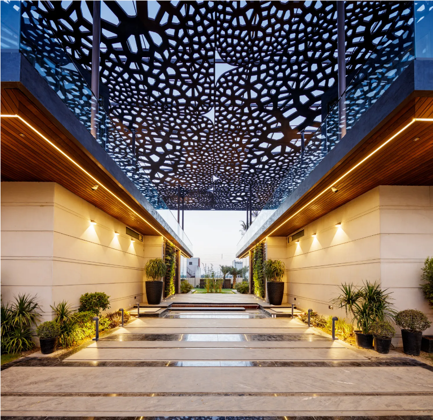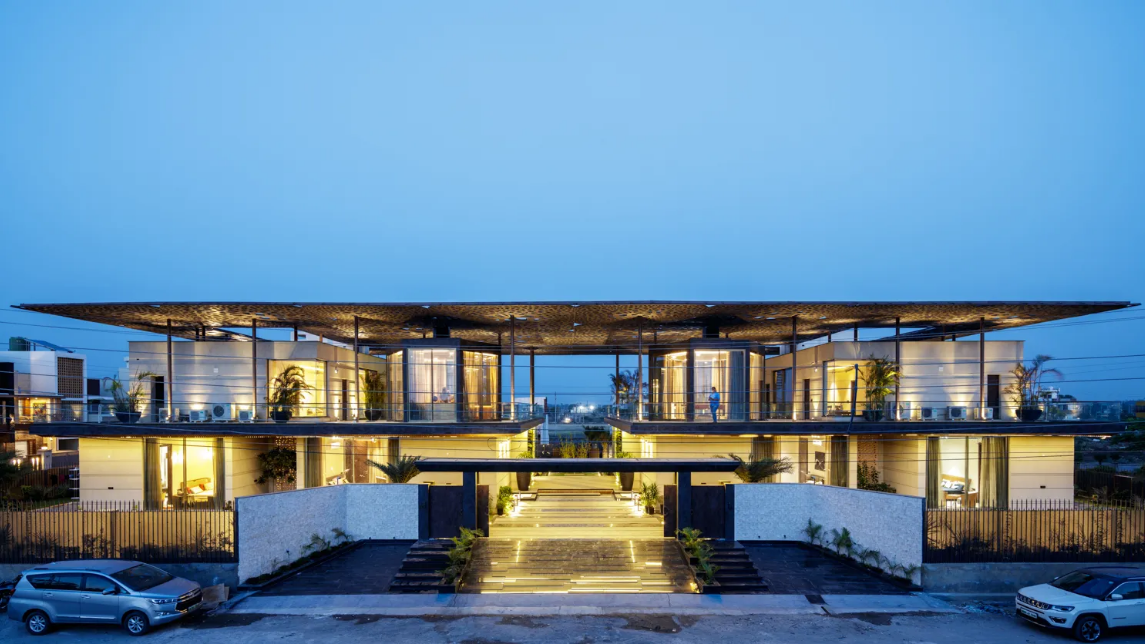 To unify both wings, the design uses consistent timber ceilings crafted from a locally sourced, fast-renewing species, along with entry surfaces clad in dark, leather-like Gwalior mint stone. The approach blends time-tested principles with contemporary expression and materials reinterpreted through a modern Indian lens.