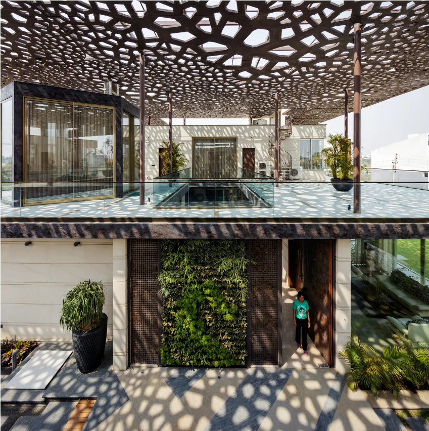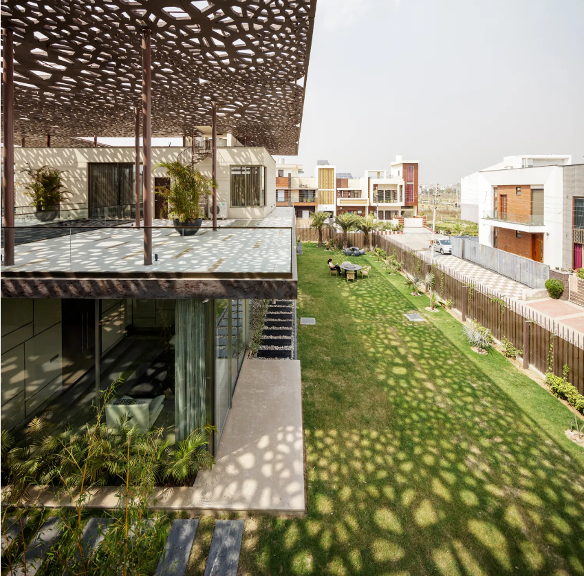 On the outskirts of Karnal, Haryana, a large home for a joint family has been designed as a small, self-supporting ecosystem. Conceived by the sustainability-focused Zero Energy Design (ZED) Lab, the project explored how to restore comfort to a barren plot in a way that stays gentle on the landscape and supports local biodiversity. Rastogi recalls that the site felt almost uninhabitable without shade—an insight that directly shaped the project’s defining move: a generous canopy that makes outdoor movement comfortable throughout the day.